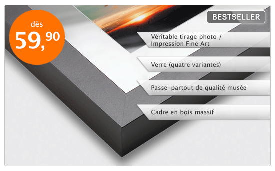 Le cadre-galerie avec passe-partout rehausse votre photographie de façon classique et décorative : avec un passe-partout dans le plus fin carton de musée, disponible en plusieurs couleurs, vous mettez l’accent sur le sujet du motif.